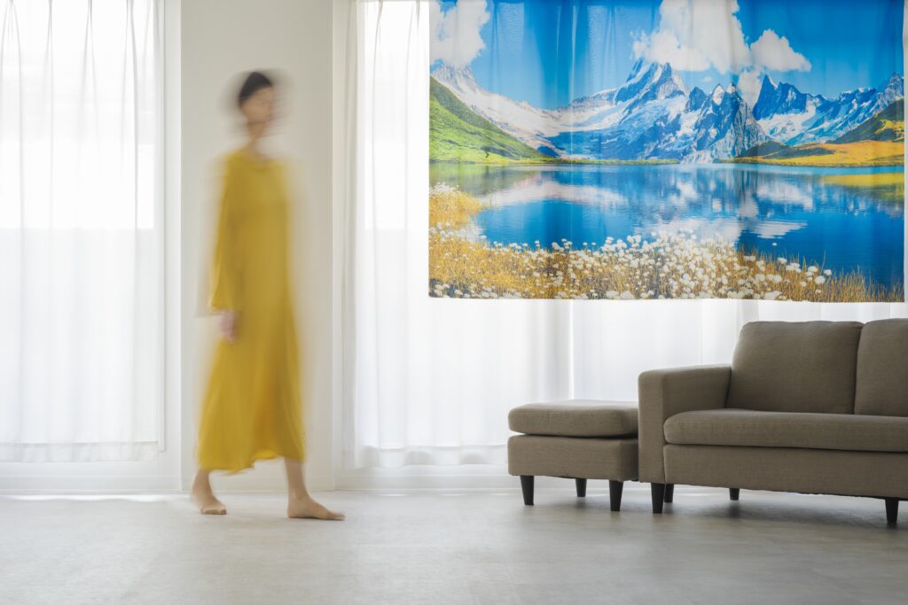 “癒しTrip®”は心安らぐ癒し空間を演出する今お使いのカーテンに重ね付け・差しかえができる特許取得のカーテンです。 懐かしい風景や憧れの景色、やさしいイラストなどが広がり、日常の中にそっと温もりと癒しをもたらします。 あなたと大切な人の時間を、やさしく彩ります。