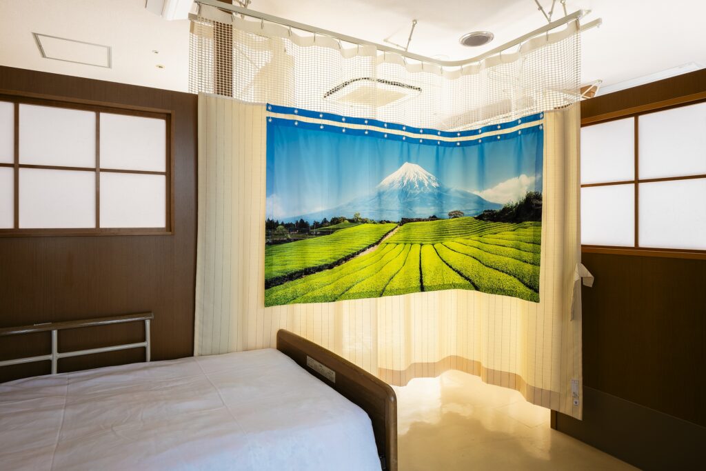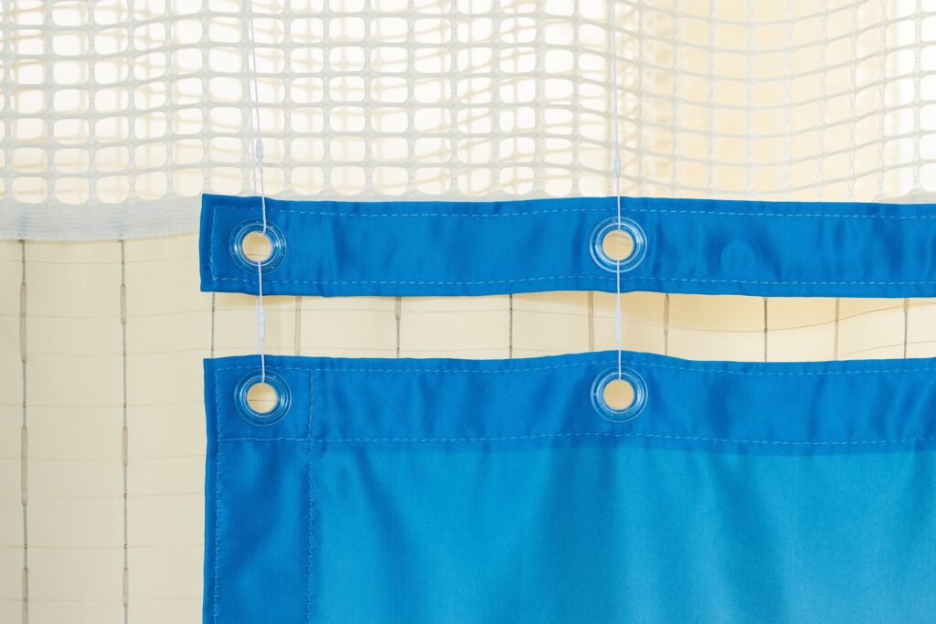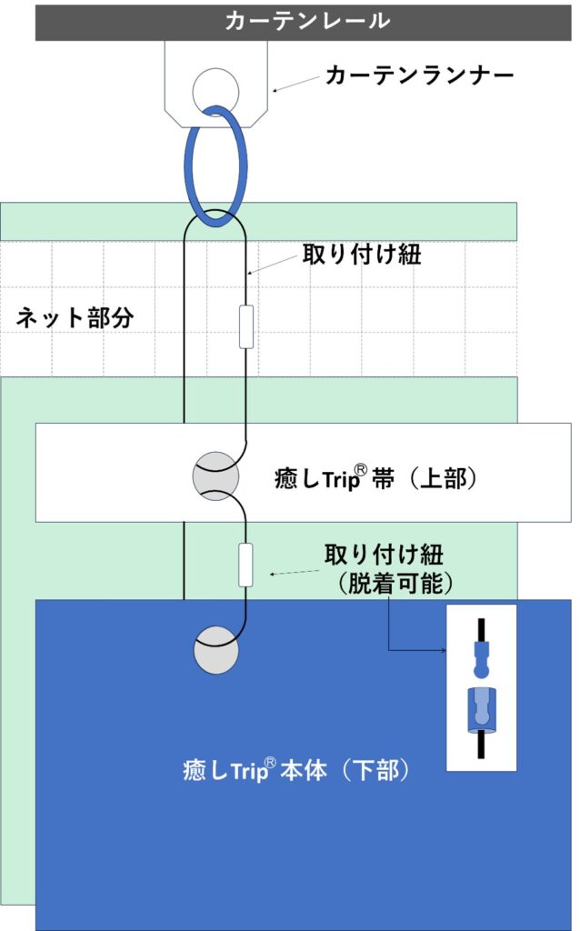 病院や施設の場合、上部ネット部分を覆わない長さの取り付け紐で装着可能です。高い位置にカーテンレールがあり、みたい目線にかけたい場合、取り付け紐で高さを調整できます。その場合、注文の寸法に合わせた取り付け紐をご用意いたします。